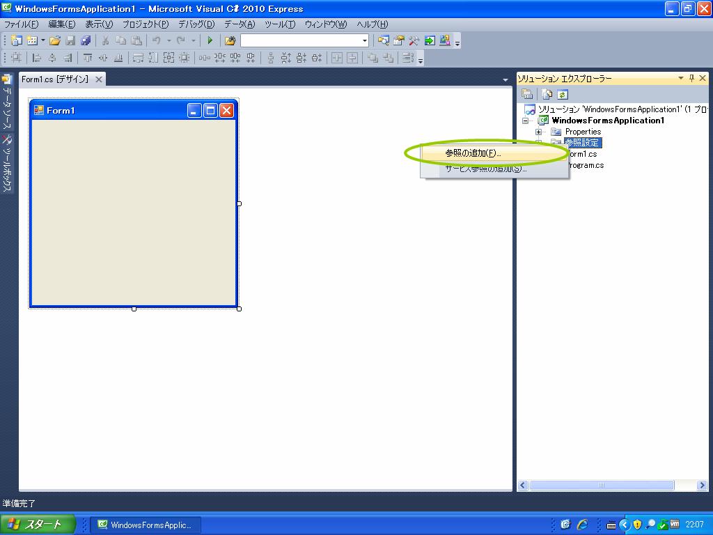 『ソリューション エクスプローラー』で「参照設定」を右クリックして、[参照の追加]をクリック